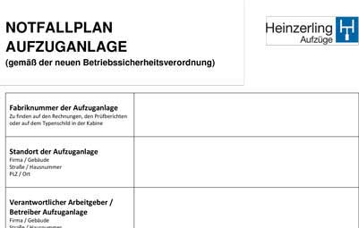 Hier finden Sie unsere Vorlage für den Notfallplan, der laut neuer BetrSichV 2015 für jede Aufzuganlage erstellt werden muss.