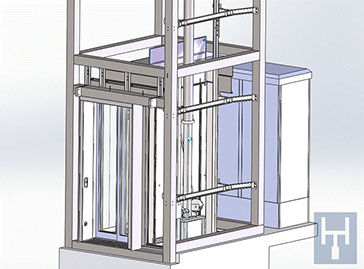 Durch den Einsatz von platzsparender Technik kann auf einen eigenen Maschinenraum verzichtet werden. Die Aufzugsteuerung und das Hydraulikaggregat werden im Fahrschacht untergebracht und sind über eine separate seitliche FH-Tür zugänglich.
