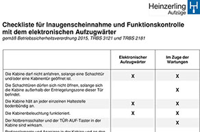 Anhand dieser Checkliste können Sie nachvollziehen, welche Punkte täglich von dem elektronischen Aufzugwärter überprüft werden und welche Punkte durch unsere Servicetechniker im Zuge der angepassten Wartung kontrolliert werden.