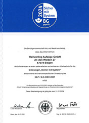 Qualität und Sicherheit gehören für uns zusammen, gerade wenn es um die Arbeitssicherheit geht. Aus diesem Grund leben wir bei Heinzerling Aufzüge ein Arbeitsschutzmanagementsystem. Dieses Gütesiegel „Sicher mit System“ wurde uns im Januar 2012 von der Berufsgenossenschaft verliehen.