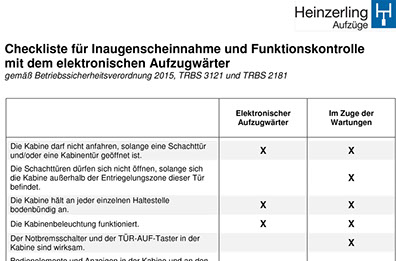 Anhand dieser Checkliste können Sie nachvollziehen, welche Punkte täglich von dem elektronischen Aufzugwärter überprüft werden und welche Punkte durch unsere Servicetechniker im Zuge der angepassten Wartung kontrolliert werden.