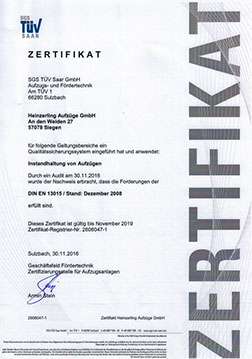 Die Heinzerling Aufzüge GmbH ist nach der DIN EN 13015 zertifiziert. Diese regelt die Durchführung der Instandhaltungsarbeiten.